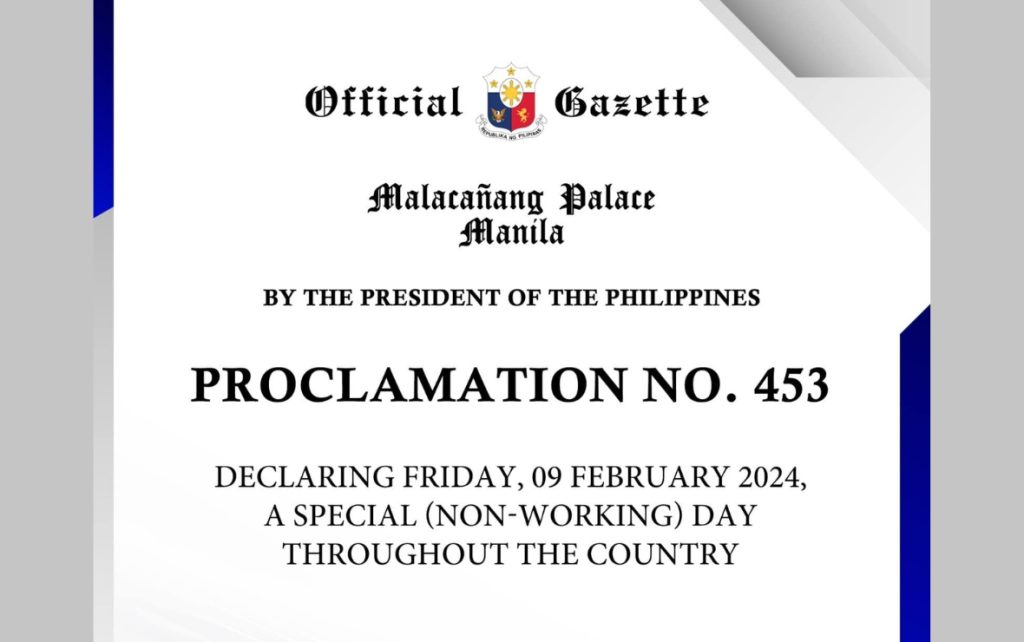 MALACAÑANG issued Proclamation No. 453 declaring February 9, 2024 a special non-working day throughout the country for the celebration of the Chinese New Year....
