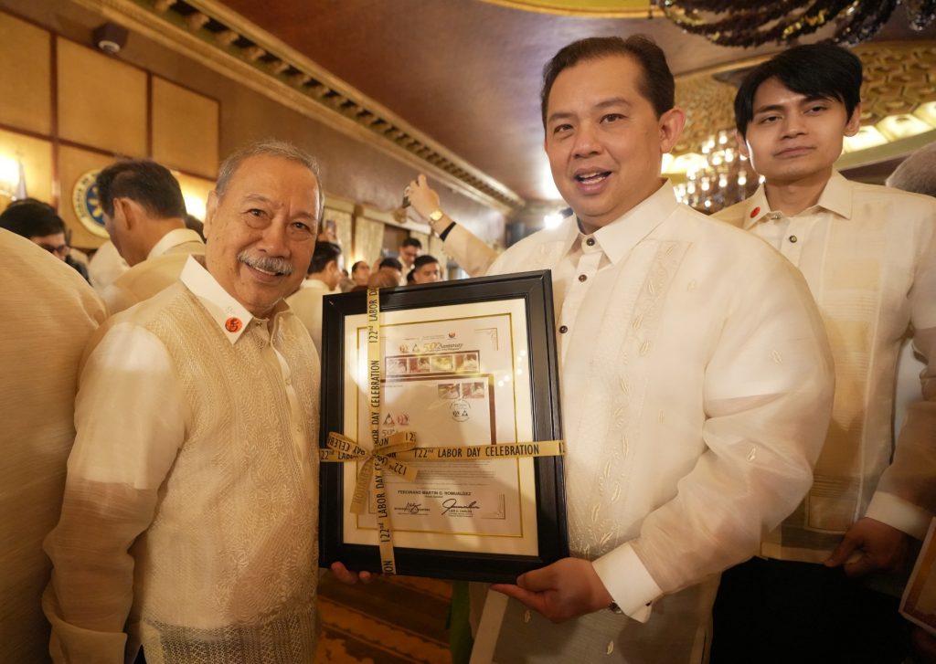 DEPARTMENT of Labor and Employment (DOLE) Undersecretary Felipe N. Egargo Jr. hands over to Speaker Martin Romualdez a commemorative stamp for the 50th anniversary...