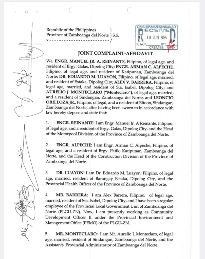 According to the 41-page complaint filed with the Office of the Deputy Ombudsman for Mindanao in Sta. Ana, Davao City on June 18, 2024, the former officials approved the resolution confirming the donations of properties, equipment, and supplies belonging to the provincial government in favor of other local government units (LGUs) and agencies just before Governor-elect Rosalina Jalosjos assumed office in June 2022.