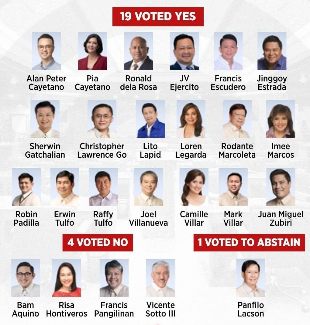 Among the senators who voted yes to archive the impeachment case were Alan Peter Cayetano, Pia Cayetano, Ronald Dela Rosa, JV Ejercito, Francis Escudero, Jinggoy Estrada, Sherwin Gatchalian, Bong Go, Lito Lapid, Loren Legarda, Rodante Marcoleta, Imee Marcos, Robinhood Padilla, Erwin Tulfo, Raffy Tulfo, Joel Villanueva, Camille Villar, Mark Villar, and Juan Miguel Zubiri.