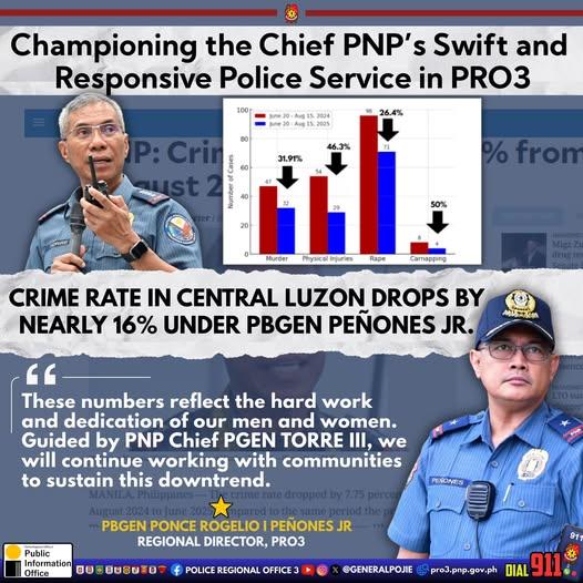 CAMP OLIVAS, City of San Fernando, Pampanga – Central Luzon recorded a 15.82% drop in focus crimes from June 20 to August 15, 2025, the Police Regional Office 3 (PRO3) reported over the weekend