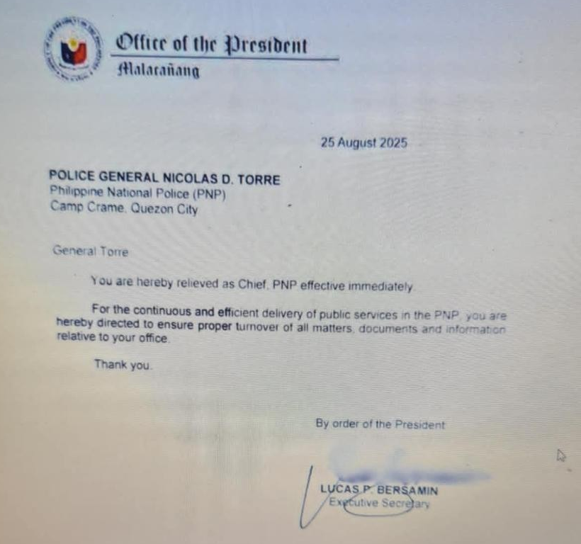 Torre’s relief was based on a memorandum issued by Executive Secretary Lucas Bersamin dated Aug. 25, 2025.