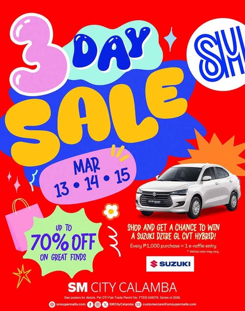 The #SM3DaySale is happening this March 13–15 at your most loved mall, SM City Calamba . Enjoy up to 70% OFF on great finds...