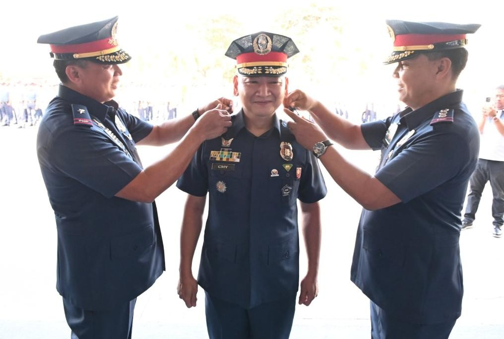 PROMOTED. Police Regional Office 3 Director Brig. Gen. Jess B Mendez and Deputy Regional Director for Operations Col. Angel L. Garcillano don rank to newly-promoted Rev Fr. Col. Jonathan L. Chy, Regional Pastoral Officer, during a flag-raising ceremony held on Monday at the PRO3 Parade Ground in Camp Olivas, City of San Fernando, Pampanga.